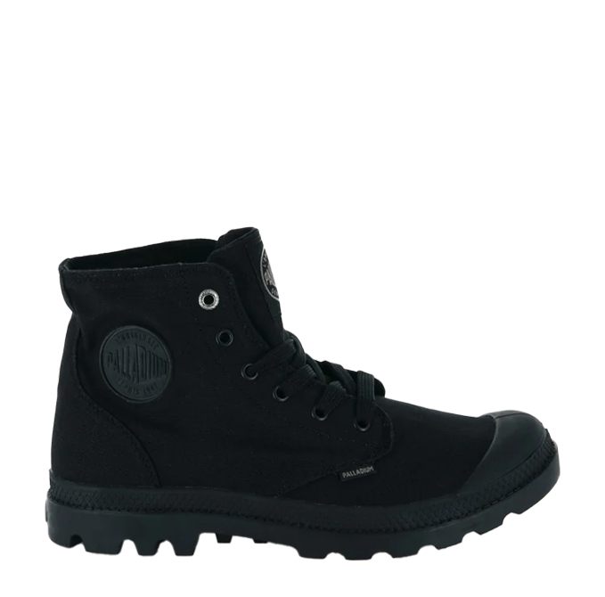 Palladium Mono Chrome Ladies Boots. This sleek, fast and trimmed-down canvas version of our famous boot is designed with the movers and shakers in mind. This athletically-inspired unisex version sports the same outsole and EVA comfort as the rest of the Pampa team, but its upper is streamlined to match your dynamic lifestyle. Pair these features with sleek, monochromatic colorways that fit in across all seasons, we have reached new Pampa levels.