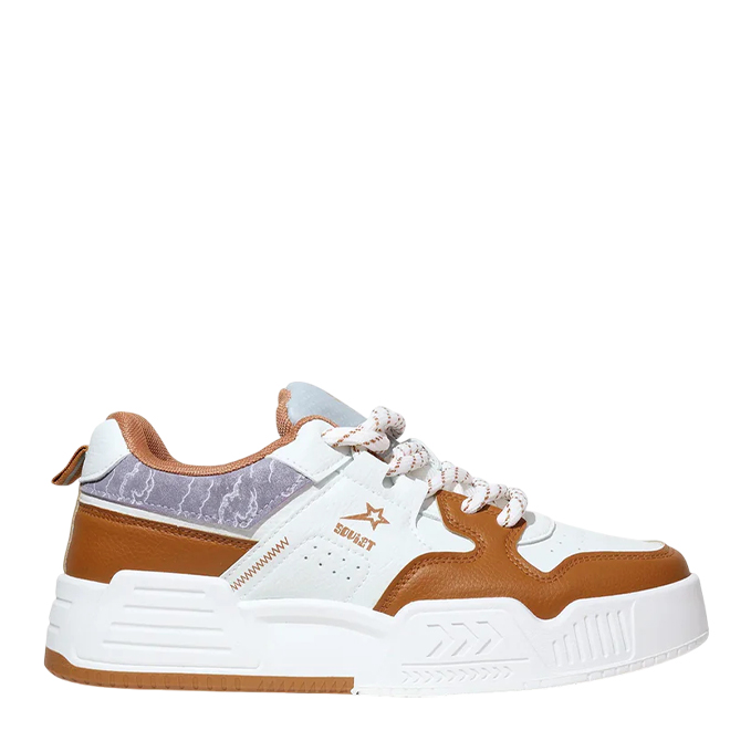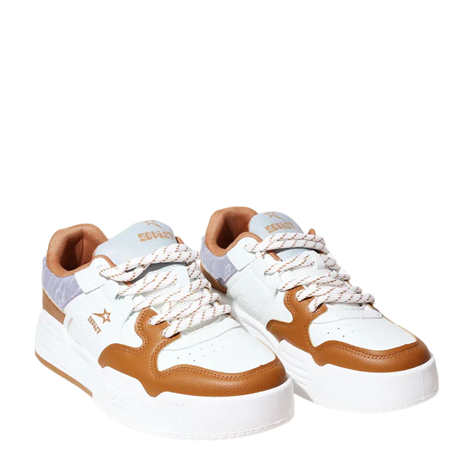 A lace-up closure provides a snug and adjustable fit. The well-structured design offers foot stability, reducing discomfort during extended wear. These sneakers ensure a secure feel with every step.